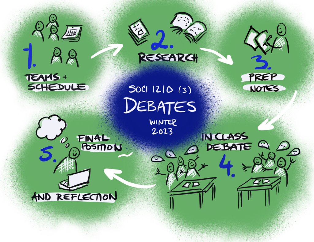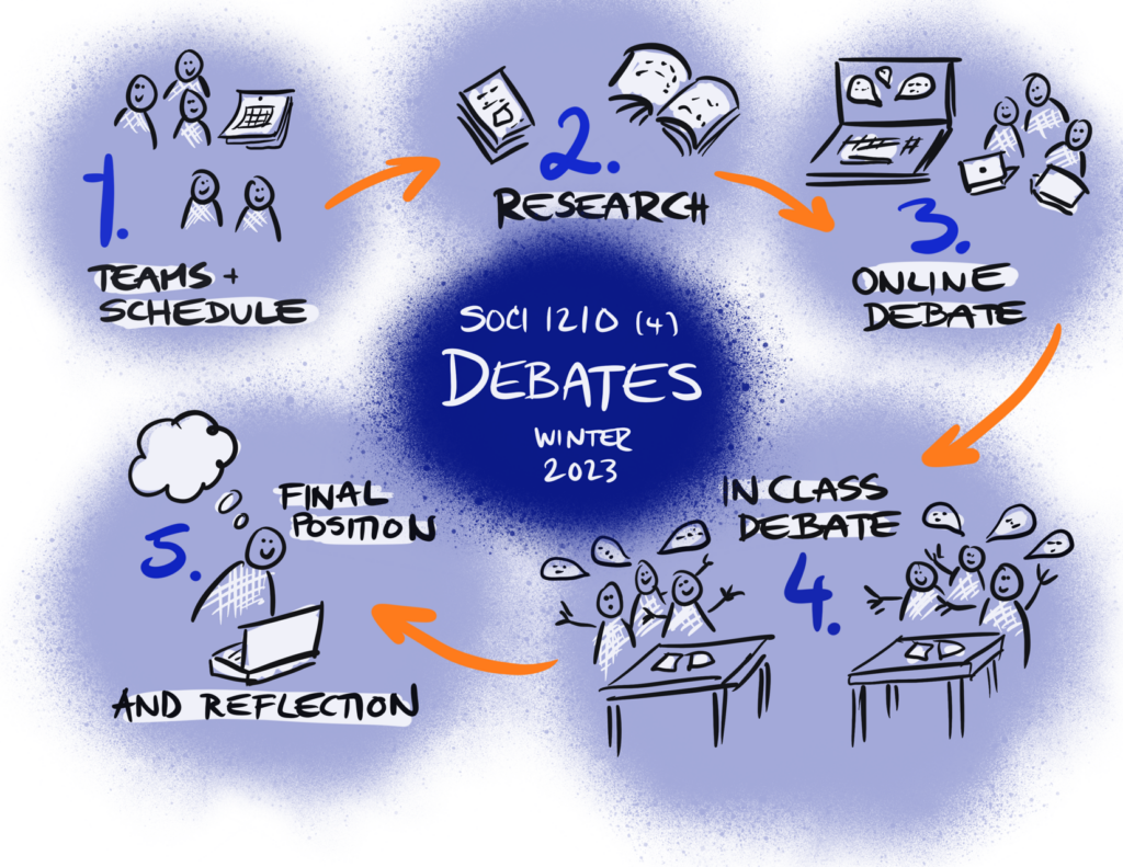 During the SoTL study, two sections of SOCI 1210 were designed to include a graded multi-stage debate activity. Section 3 debate was in-class only, while section 4 was multimode (online and in-class). All students had to research and argue online/prepare for both sides of a debate topic, then drew a pro or con side out of a hat prior to the in-class debate.