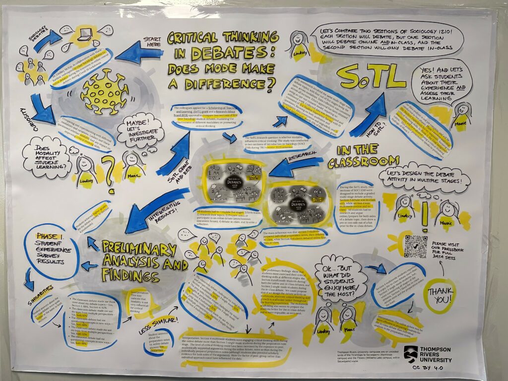The SoTL research question is whether modality influences critical thinking. The study was conducted in two sections of Introduction to Sociology (SOCI 1210) during TRU’s winter 2023 semester. The assessment involved the same multi-stage team debate topics, with four out of five stages being the same across modalities.